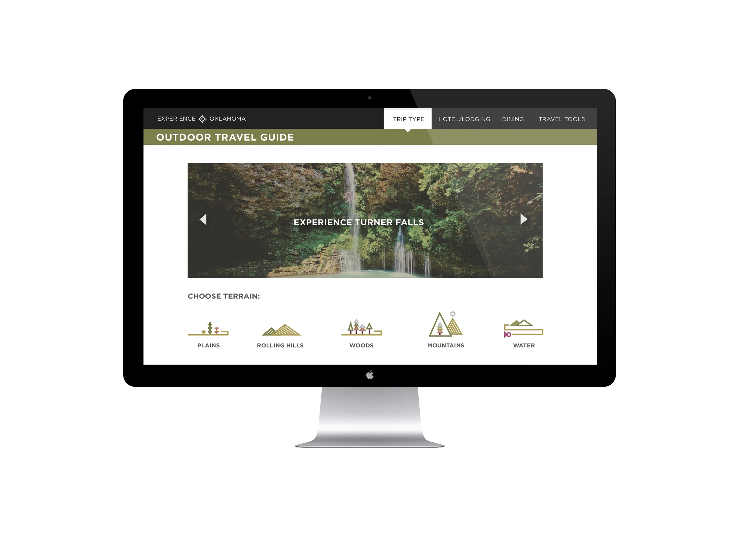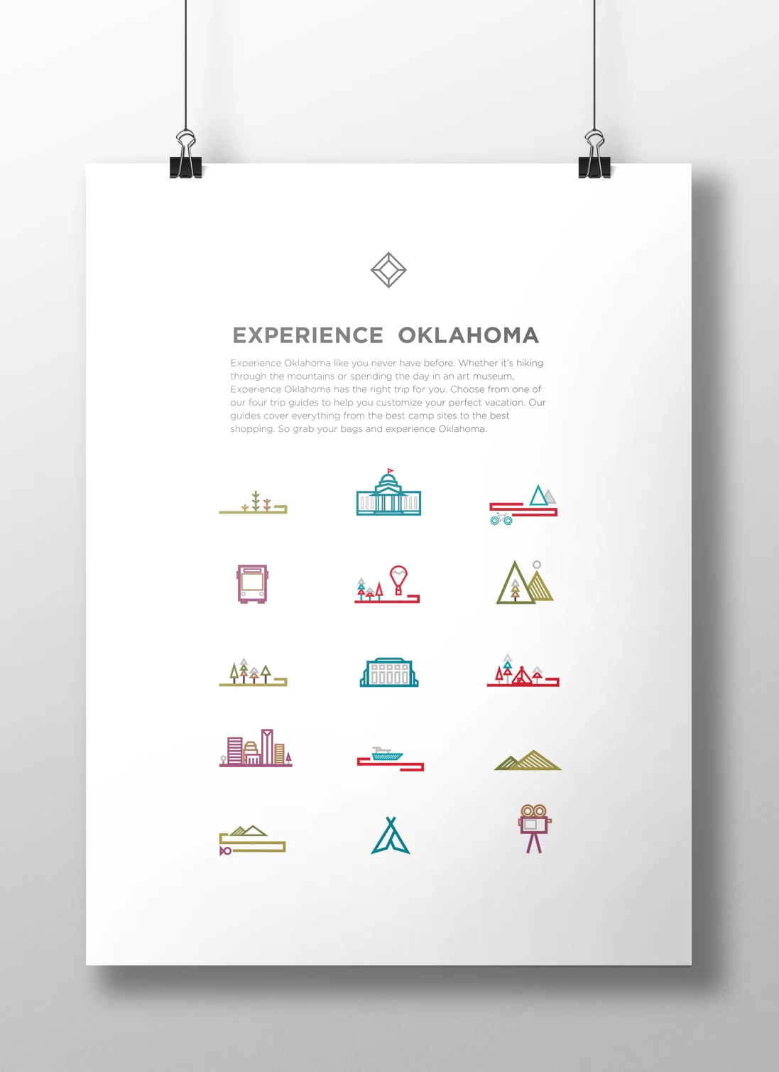 Experience Oklahoma is a branding solution for Oklahoma tourism. It is meant to showcase the state’s rich culture and opportunities for adventure. Experience Oklahoma is broken down into four trip types: historic, outdoor, adventure, and contemporary. It allows the tourist to create a trip personalized to their specific interest. Each trip type consists of a system of icons that separates the type into further categories for an intuitive and tailored experience.